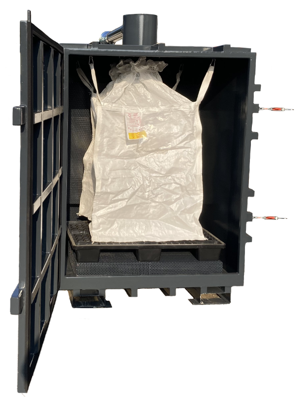 Its function is to store lightweight and bulky materials in 1 m³ big bags, such as fibre, rubber, foam or polystyrene, etc., which would otherwise be difficult to collect and discharge with normal cyclonic separators due to their characteristics.