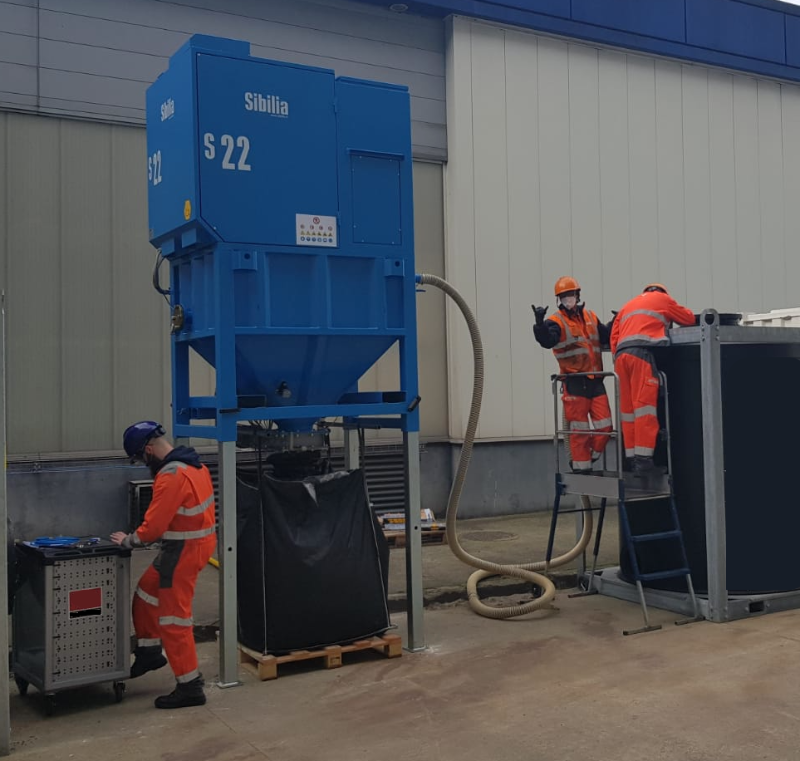 The standard version is equipped with a frame for handling with a forklift and a full opening at the bottom for discharging the vacuumed material.